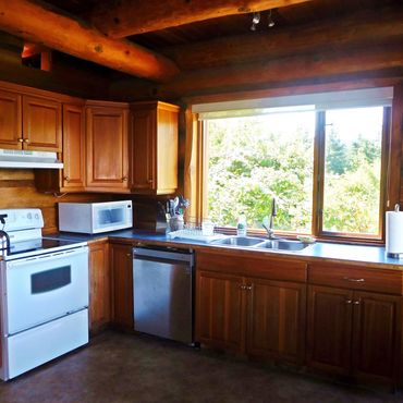 It has 3 bedrooms, 2 bathrooms w/ shower & tub, fully equipped kitchen, 3 decks and a wood burning fireplace. Outside is 2 acres of apple trees, blackberry bushes, and an ocean view.