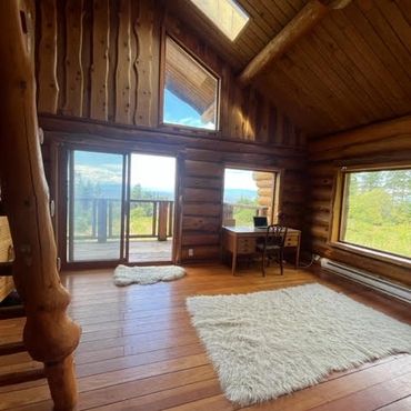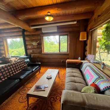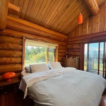 The Lazy Peach is a log cabin that sits at the top of an orchard on Gabriola Island.